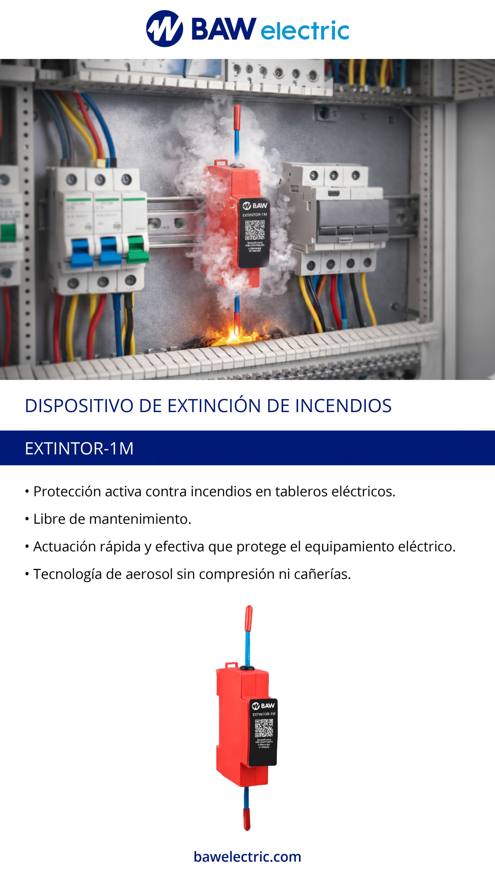 EXTINTOR-1MEl BAW-EXT1D-S1 es un dispositivo de extinción de incendios por aerosol diseñado para la supresión temprana de focos ígneos en tableros eléctricos y espacios cerrados reducidos. Su formato compacto permite montaje sobre riel DIN o instalación adhesiva, sin necesidad de almacenamiento presurizado ni instalación de cañerías. Se activa automáticamente ante llama o temperaturas superiores a 170 °C, proporcionando una protección rápida, eficaz y libre de mantenimiento para instalaciones eléctricas residenciales, comerciales e industriales livianas en Argentina.