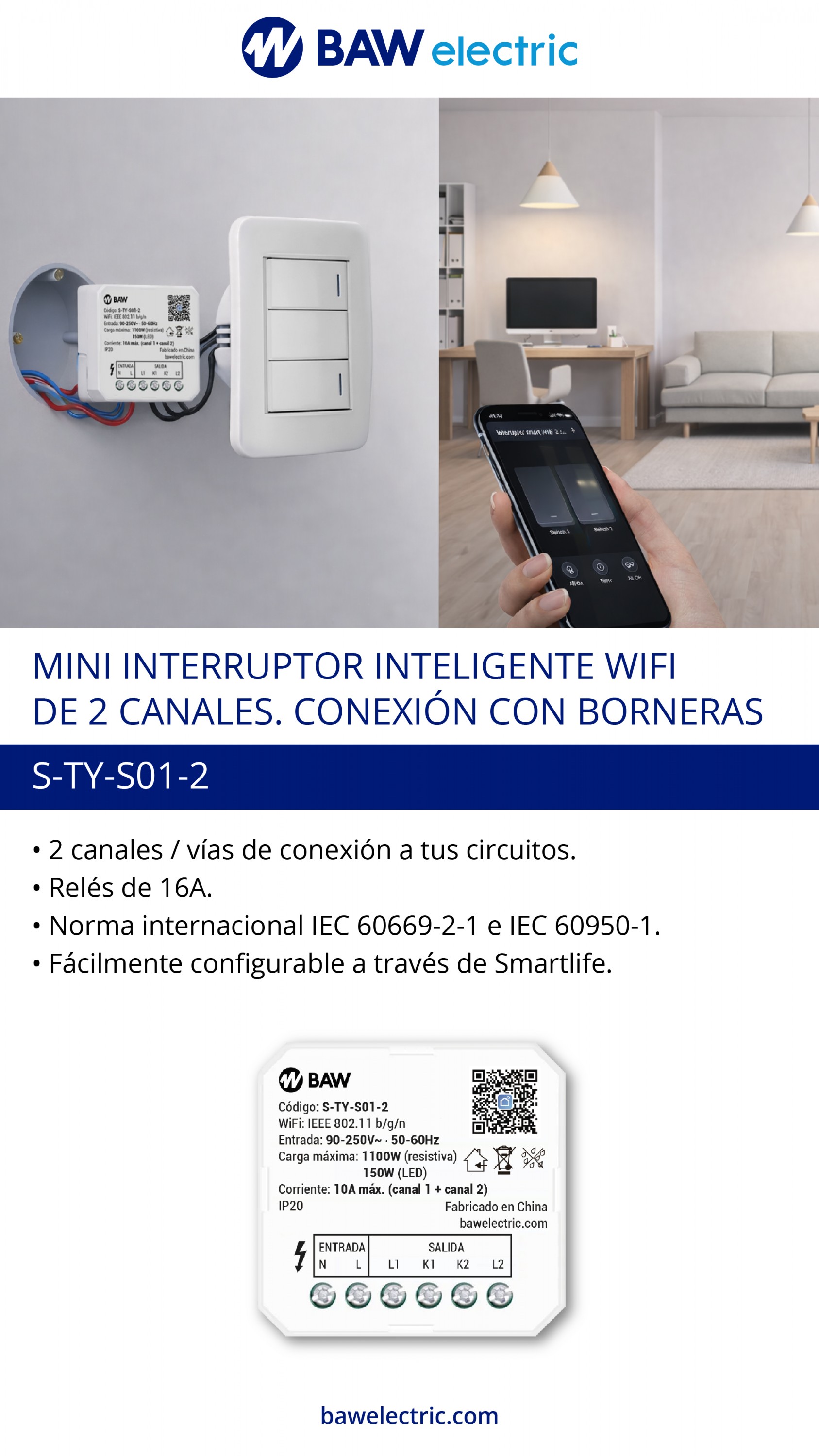 - Con relés de 16A, con amplia durabilidad para cargas de 1100W (resistiva) o 150W (iluminación LED) por salida.