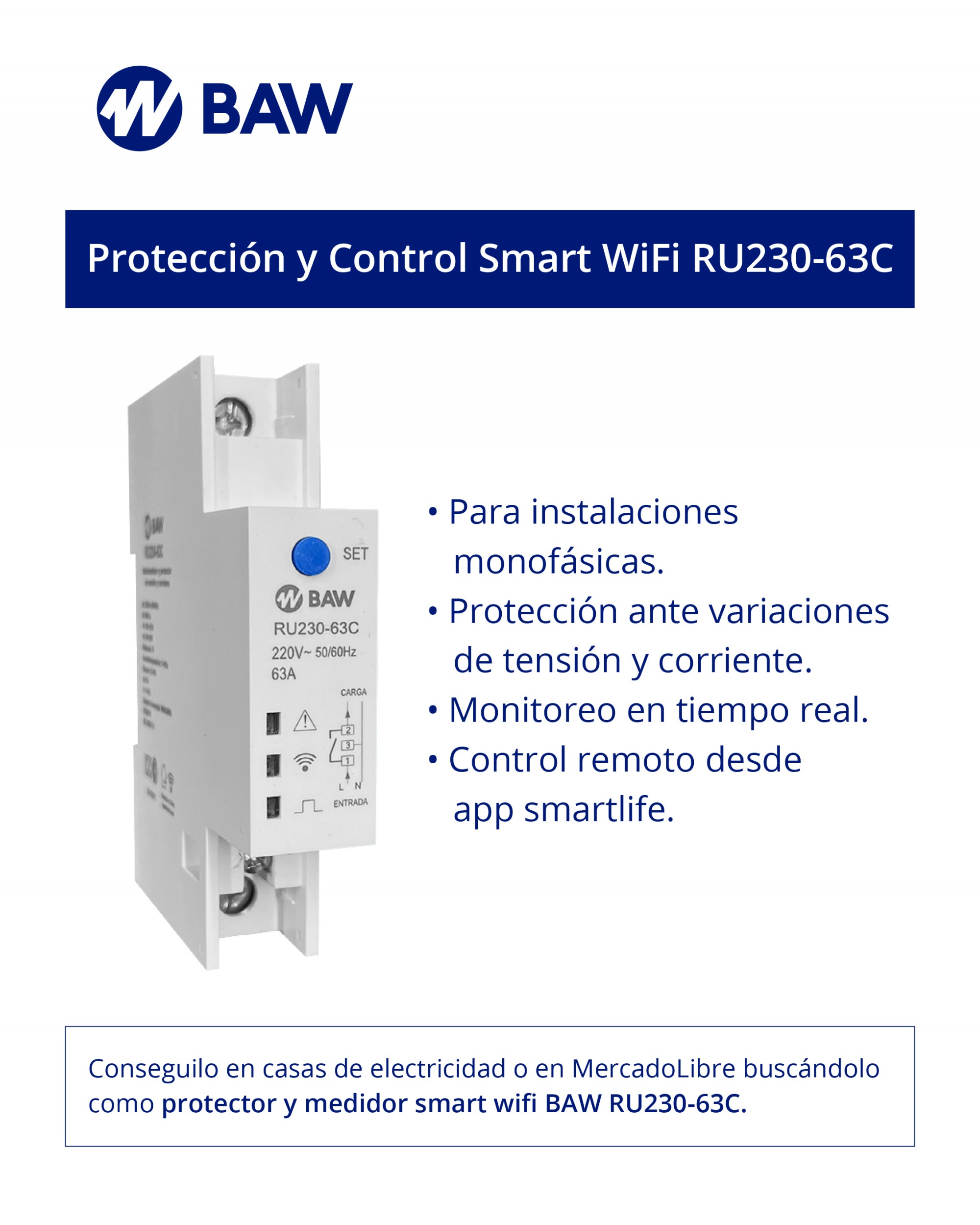 El dispositivo RU230-63C es un equipo de protección y control Smart WiFi para instalaciones eléctricas monofásicas, diseñado para montaje en riel DIN. Permite gestionar y supervisar la instalación eléctrica de forma remota mediante conectividad WiFi.