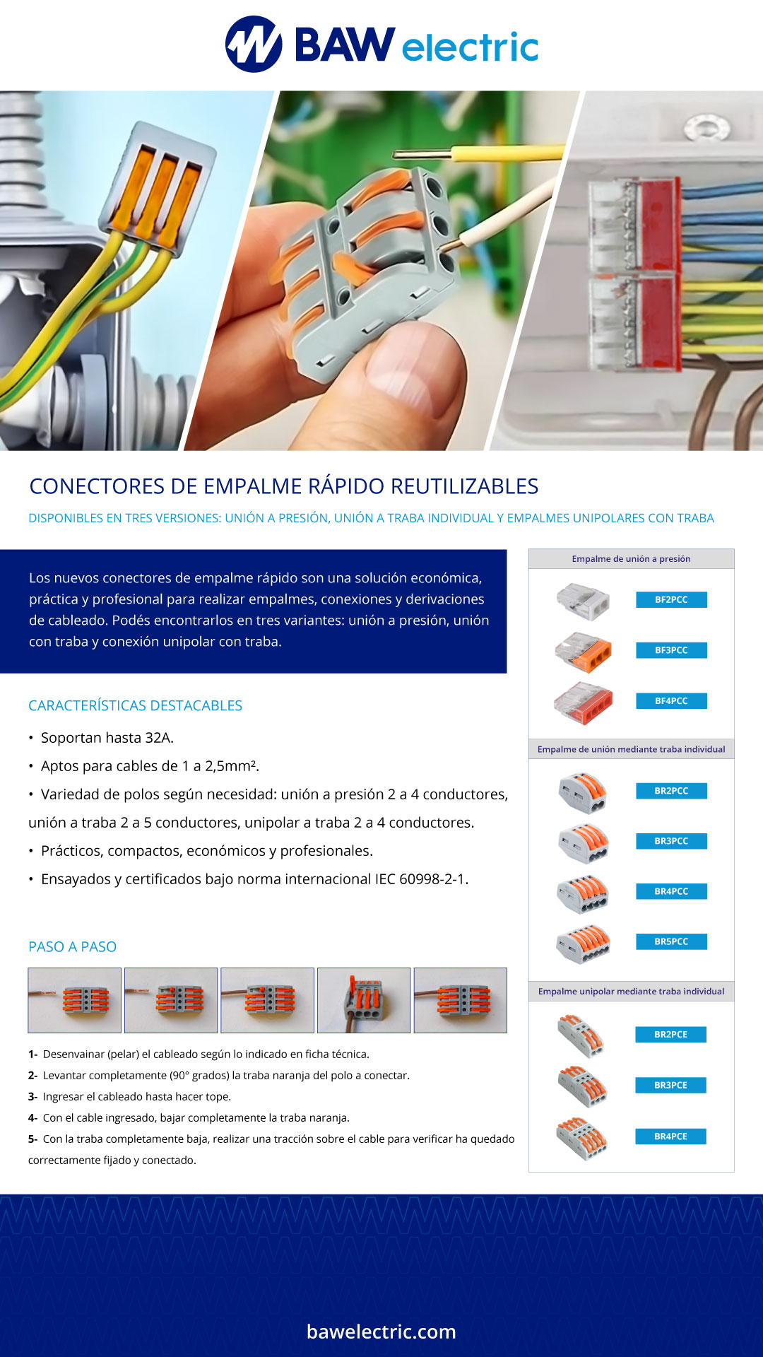 Los conectores de empalme rápido son una solución económica, práctica y profesional para realizar empalmes, conexiones y derivaciones de cableado. Podés encontrarlos en tres variantes: unión a presión, unión con traba y conexión unipolar con traba. Soportan hasta 32A. Aptos para cables de 1 a 2,5mm². Variedad de polos según necesidad: unión a presión 2 a 4 polos, unión a traba 2 a 5 polos, unipolar a traba 2 a 4 polos. Prácticos, compactos, económicos y profesionales. Ensayados y certificados bajo norma internacional IEC 60998-2-1.