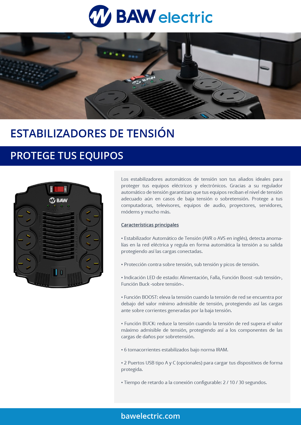 ET61000U2Y1El estabilizador de tensión automático BAW ET61000U2Y1 ofrece mayor capacidad de potencia para la protección de cargas más exigentes, manteniendo una tensión de salida estable ante fluctuaciones de la red eléctrica. Gracias a su sistema AVR y a sus puertos USB integrados, permite proteger y alimentar equipos eléctricos, electrónicos y dispositivos de uso intensivo en instalaciones de 220V.