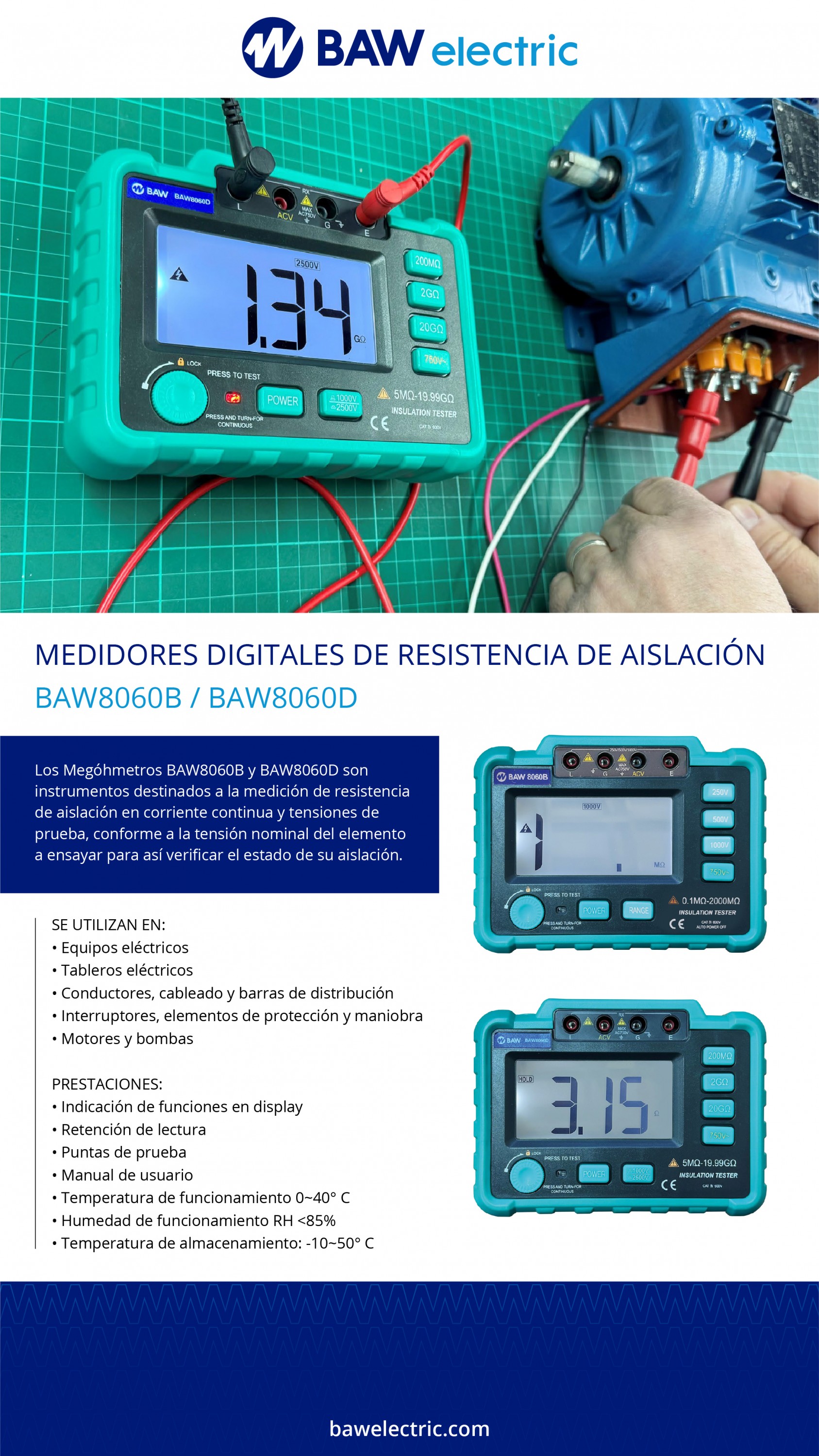 El medidor digital de resistencia de aislación BAW8060D está diseñado para la medición de resistencia de aislación en corriente continua, utilizando tensiones de prueba conforme a la tensión nominal del elemento a ensayar. Permite verificar el estado de la aislación en equipos e instalaciones eléctricas, facilitando tareas de control y diagnóstico.