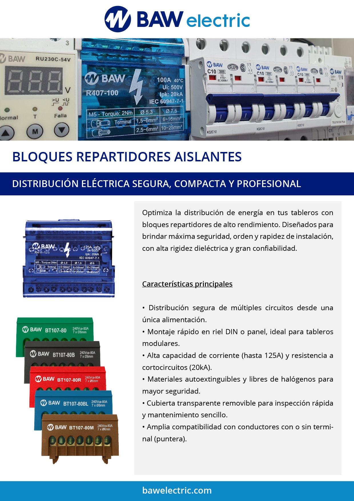 Con construcción basada en barras conductoras de cobre (equivalente 25 mm²) y envolvente aislante de poliamida libre de halógenos, ofrecen alta resistencia eléctrica y mecánica. Incorporan cubierta frontal removible de policarbonato transparente y separadores internos que facilitan el conexionado.