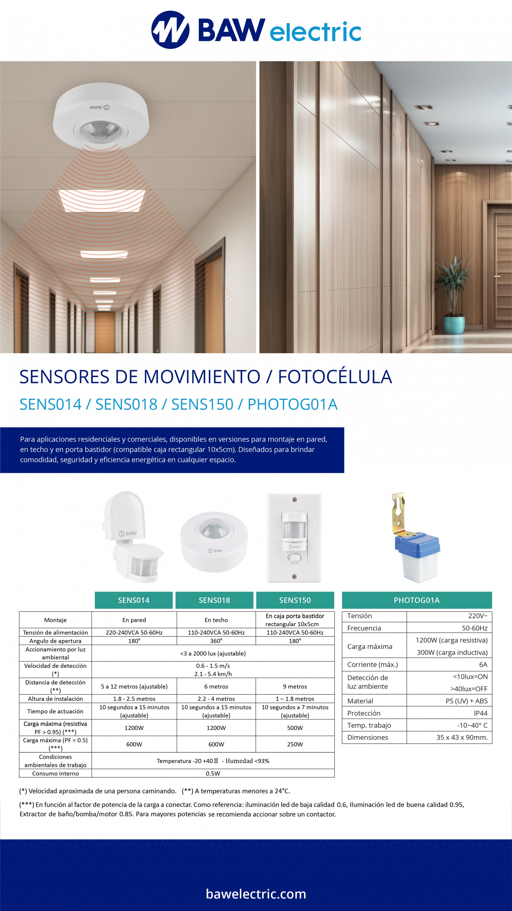 Montaje: en caja tipo bastidor rectangular 10x5cm Tensión de alimentación: 110-240VCA 50-60Hz Ángulo de apertura: 180° Accionamiento por luz ambiental: 0.95) (***): 500W Carga máxima (PF = 0.5) (***): 250W Condiciones ambientales de trabajo: Temperatura -20 a +40 ºC / Humedad <93% Consumo interno: 0.5W (*) Velocidad aproximada de una persona caminando.(**) A temperaturas menores a 24°C.(***) En función al factor de potencia de la carga a conectar.Como referencia: iluminación led de baja calidad 0.6,Iluminación led de buena calidad 0.95, Extractor debaño/bomba/motor 0.85. Para mayores potencias serecomienda accionar sobre un contactor.
