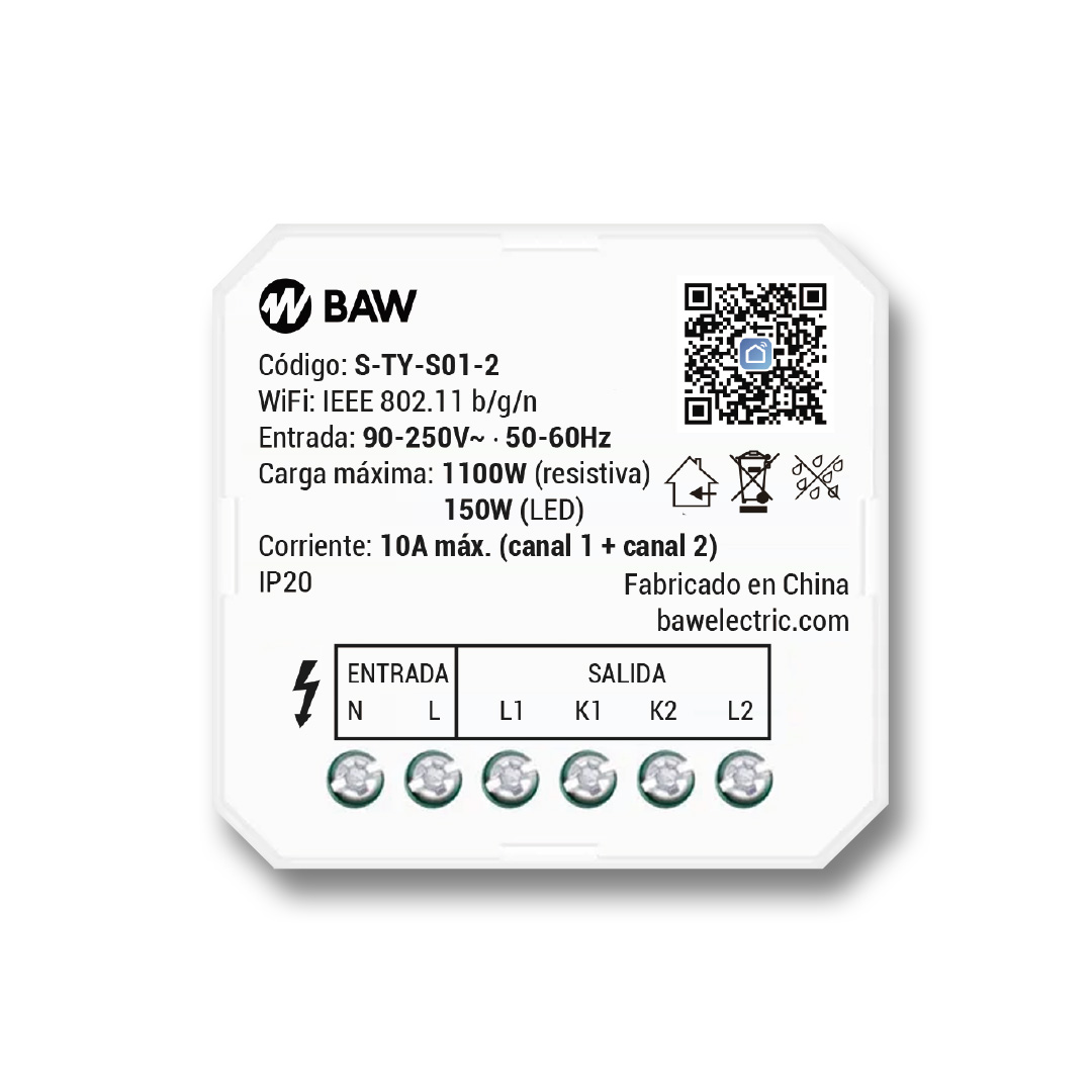 Mini interruptor inteligente WiFi de 2 canales. Conexión con borneras.
